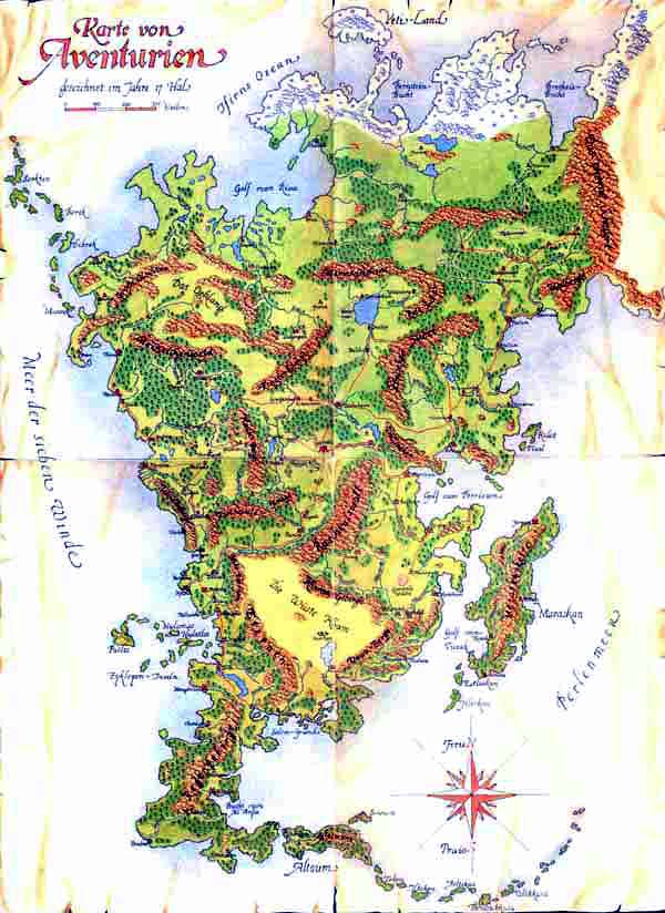 Die Grundidee Sie haben doch sicherlich schon hin und wieder erlebt: Sie lesen gerade ein Buch oder sehen einen Film, und plötzlich tut der Held darin etwas, von dem sie genau wissen, das es völlig falsch ist- Sie hätte selbstverständlich ganz anders und (natürlich) viel besser gemacht: Am liebsten würden Sie nun in die Geschichte eingreifen und die Sache selbst in die Hand nehmen. Aber das geht nicht. Unbeirrt von Ihren guten Ideennimmt die handlung in Buch oder Film ihren Lauf. Genau hier setzt die Idee des Rollenspieles an: Sie selbst schlüpfen in die Rolle der Hauptfigur der Geschichte und können nun selbst entscheiden, was Sie tun wollen. Und dann erleben Sie selbst alle jene Abenteuer, an denen Sie bisher, als zuschauer oder Leser, nur passiv teilnehmen konnten. Sie erforschen uralte Ruinen, kämpfen gegen Ungeheuer, lösen verzwickte Kriminalfälle oder erleben die Dinge nach denen sie sich schon immer gesehnt haben. Naturlich müssen Sie sich dazu nicht wirklich verkleiden, und sie müssen Sie müssen auch kein Schwert in die hand nehmen: iese Geschichze findet in Ihrer fantasie statt. Zu einem Rollenspiel treffen Sie sich also mit Freundinnen oder Freunden, ebenso wie zu einem Brettspiel. Und für einen Außenstehenden sieht es auch erst einmal genauso aus, bloß dass auf dem Tisch, an dem sie sitzen, kein Spielbrett liegt, sondern nur ein paar zette, Stifte und Würfe. Außerdem spielen Sie nicht gegeneinander, sondern miteinander. Denn jeder Spieler stellt eine Rolle dar, die ganz spezielle Fähigkeiten und Stärken besitzt. Und nur, wenn alle gut zusammen arbeite, wird das Abenteuer auf die optimale Weise gelöst. Die Rollen Jeder ispieler übernimmt also eine Rolle(wie in einem Film)- wir sprechen hier von den "Helden" , die von den Spielern geführt werden. So könnte ein Spieler einen kampfgewaltigen Krieger verkörpern (auch wenn er im echten Leben keine Ahnung vom Schwertkampf hat), eine Mitspielerin die verschlagene Streunerin ( obwohle sie eigentlich eine grundehrliche Haut ist) und ein weiterer Spieler den weisen Magier ( und muss dazu noch nicht einmal die einfachsten Zaubertricks beherrschen): Was der einzelne Held kann, steht auf einem Blatt: dem "Heldendokument". Darauf ist nicht nur verzeichnetwie groß und wie schwer er ist sondern auch, ob er klug,geschicktoder schön istund wie gut er reiten, schwimmen, kletter oder kämfen kann. Der Meister Eine ganz besondere Aufgabe übernimmt der Spielleiter oder "Meister". Als einziger hat er keine bestimmte Rolle, sondern ist zugleich Regisseur, Kameramann, Schiedsrichter und Darsteller aller Nebenrollen. Er kennt schon von vornherein das Abenteuer, in das er seine Spieler hineinschickt. Er weiss also zu beispiel bei einem Kriminal Abenteuer, wer der Mörder ist und wo die Helden hinweise finden können, um den Täter zu entlarve. Und ebenso weiss er auch, an welchen Stellen Gefahren lauern. Wenn die Spieler entscheiden, einen Raum zu betreten, dann erzählt der Meister ihnen wie es in diesem Raum assieht: Und wenn der Held vorher an der Tür lauschen will, dann weiss der Meister ob es etwas zu lauschen gibt.Sollte aber zufällig ein Wachposten vorbei kommen so schlüpft der Meister in die Rolle des Wachposten, der nun den Ertappten befragen oder vielleicht sogar festnehmen will. Das heisst aber nicht das der Meister gegen die Spieler spielt. In einem Moment kann er die Rolle des finsteren Gegenspielers übernehmen, im nächsten Moment ist er aber der hilfsbereite Passant, der den Helden wichtige Tipps und Hinweise gibt. Damit ist seine Aufgabe sehr anspruchsvoll und vielseitig, aber gerade deshalb macht sie auch besonders viel Spaß. Regeln Jedes Abenteuer, jeder Film und jedes Buch wäre langweilig, wenn die Helden allmächtig wären ind ihnen immer alles gelingen würde. Es ist nun einmal schwierig, eine feuchte Burgmauer hinauf zu klettern, auch wenn dahinter noch so viele Prinzessinen auf Rettung warten. Manche Helden können natürlich besser klettern als andere, dafür können jene helden besser kämpfen oder reiten. Um diese unterschiedlichen Fähigkeiten zu verdeutlichen, gibt es bestimmte Spielregeln. Ein Held, der eine Wand hochklettern will, muss also würfeln, ob er das schafft- und je besser er klettern kann, desto wahrscheinlicher ist es, dass ihm dies auch gelingt. Auf diese Weise bleibt es immer , denn niemand kann sich darauf verlassen, das er jene mauer erklimmen kann- oder eben jeden gegner besiegen, jede alte Inschrift lesen und so weiter: Aber wenn einmal ein Würfelwurf nicht gelingt, ist das noch lange kein Beinbruch- dann müssen sich die Helden einen anderen Weg suchen, um an ihr Ziel zu gelangen: Und so können sie gemeinsam jede Aufgabe lösen und jedes Abenteuer bestehen: Sie werden sehen, aus diesen einzelnen Abenteuern werden bald ganze Geschichten, in denen Sie, in der Haut ihres Helden, die unterschiedlichsten Dinge erleben. Alles ist möglich, und es gibt nur eine Grenze- Ihre eigene Fanrasie. Also: Probieren Sie es einfach aus  Das ist ein typischer DSA Würfel er hat 20 Seiten, bei den meisten DSAlern ist er bekannt als W20 Aventurien....auf diesem fiktiven Kontinent spielen die Helden